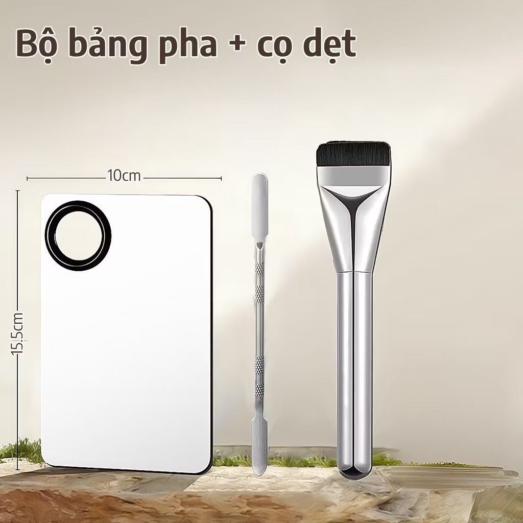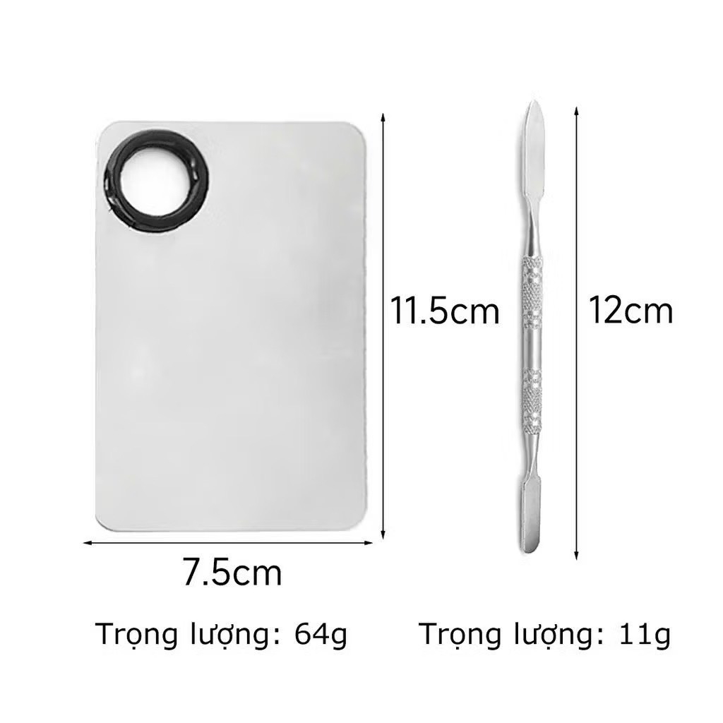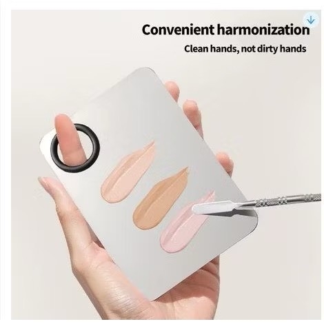 Bộ dụng cụ makeup tiện lợi với khay inox mini giúp trộn kem nền, kem dưỡng, phấn nước nhanh gọn. Kèm theo thìa trộn nhỏ dễ thao tác, phù hợp dùng hàng ngày hoặc mang theo túi đồ trang điểm.
