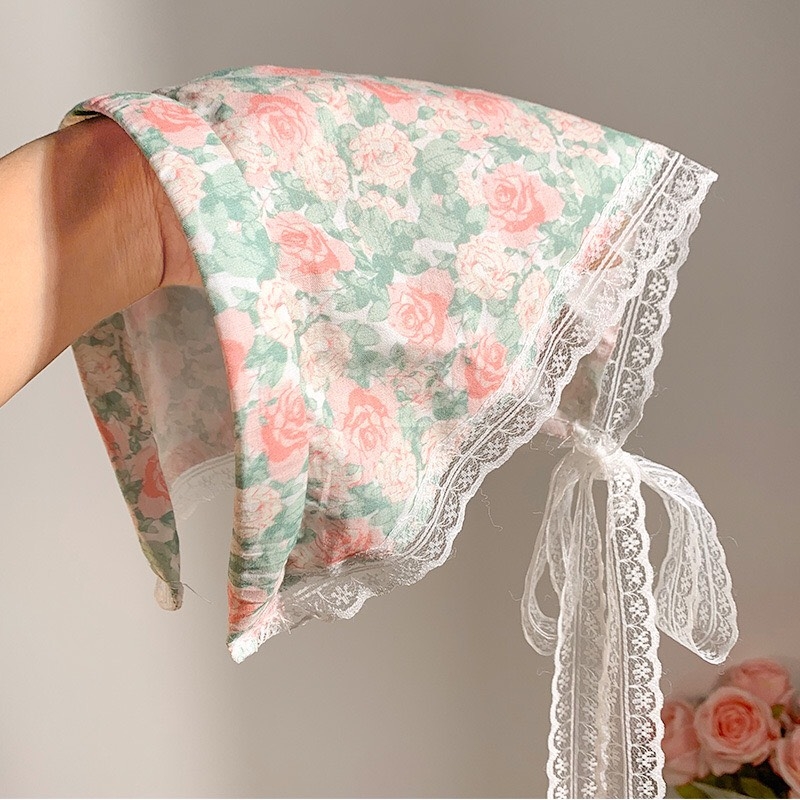 Thiết Kế Độc Đáo: Kết hợp giữa phong cách vintage của khăn trùm đầu và sự nữ tính của họạ tiết hoa, điểm xuyến ren tinh tế.