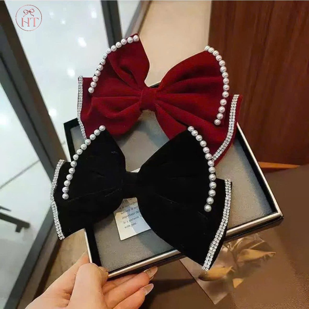 Kẹp tóc nơ nhung đính ngọc & đá phong cách Hàn Quốc là phụ kiện giúp tôn lên vẻ dịu dàng và thanh lịch cho phái đẹp. Thiết kế nơ nhung mềm mại kết hợp chi tiết đính ngọc trai và đá lấp lánh tạo điểm nhấn nổi bật cho mái tóc.