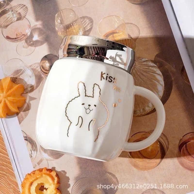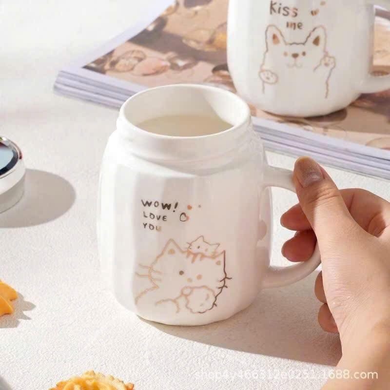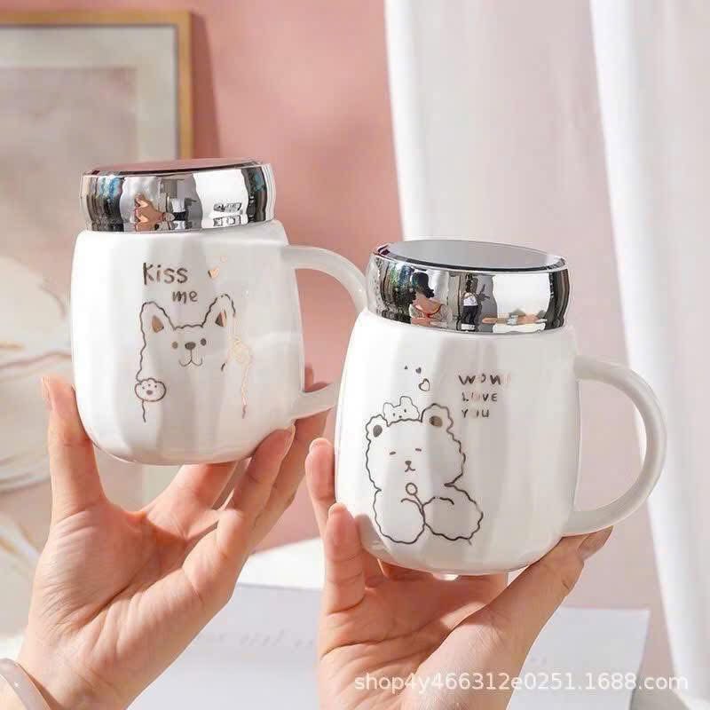 Ly sứ có quai cầm tiện lợi, đi kèm nắp gương độc đáo và họa tiết hoạt hình dễ thương. Thiết kế vừa xinh xắn vừa hiện đại, phù hợp dùng uống nước, trà, cà phê tại nhà, văn phòng hoặc làm quà tặng đáng yêu.