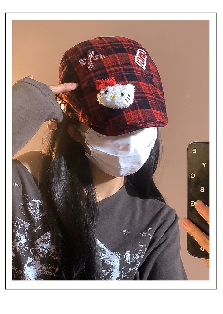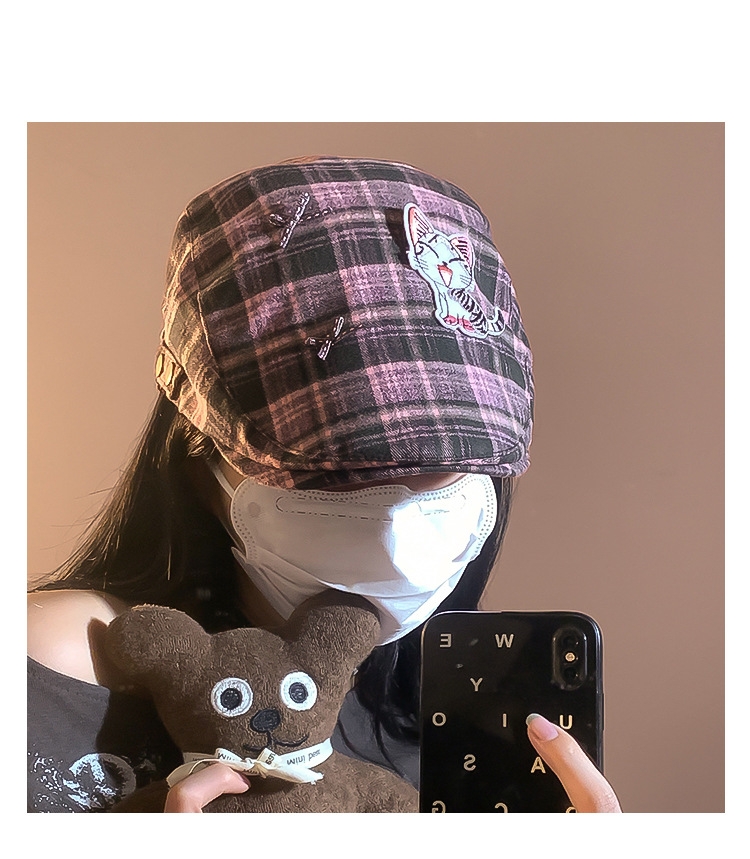 Mũ nồi kẻ caro đính gấu bông/ sticker vintage, thiết kế họa tiết caro cổ điển kết hợp phụ kiện gấu bông/sticker xinh xắn. Chất liệu mềm mại, form ôm vừa vặn, mang lại vẻ ngoài vừa dễ thương vừa phong cách retro, thích hợp đội khi đi chơi, chụp ảnh hay dạo phố.