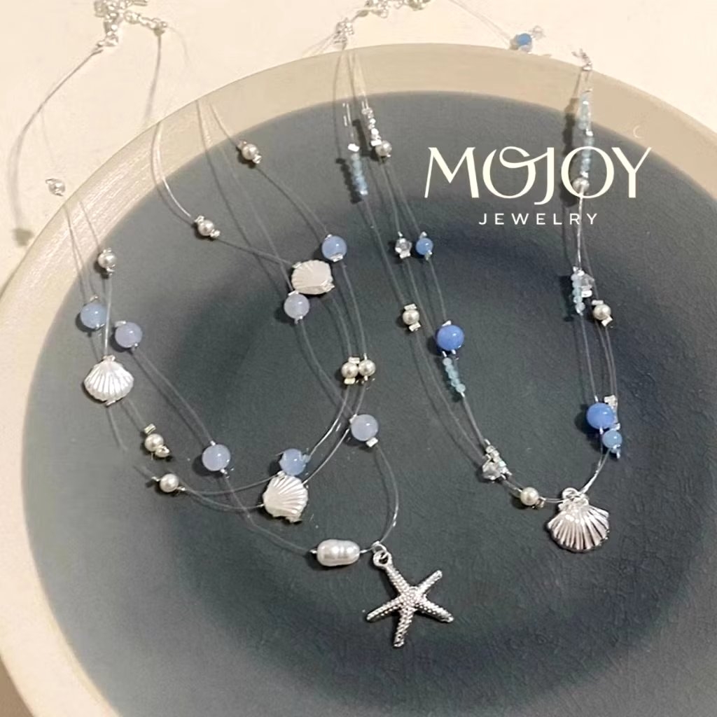 Vòng Cổ Sợi Cước 3 Vòng Vỏ Sò Sao Biển Đá Ngọc Xanh